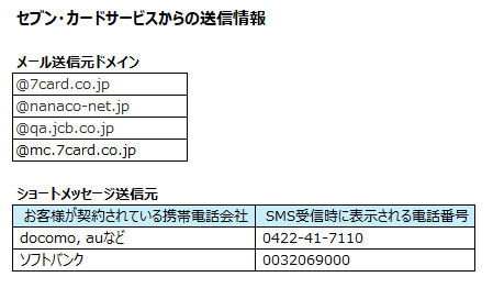 株式会社セブン・カードサービスからご案内するメール、ショートメッセージの送信元情報は以下をご確認ください。