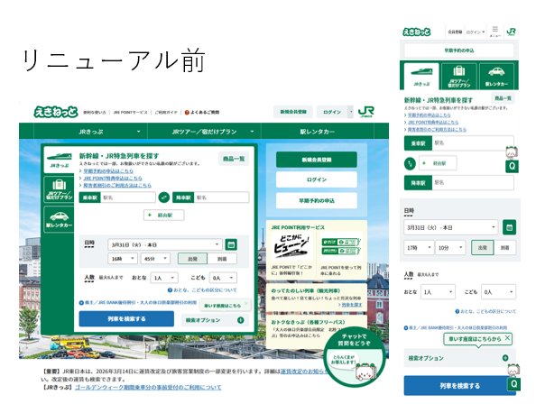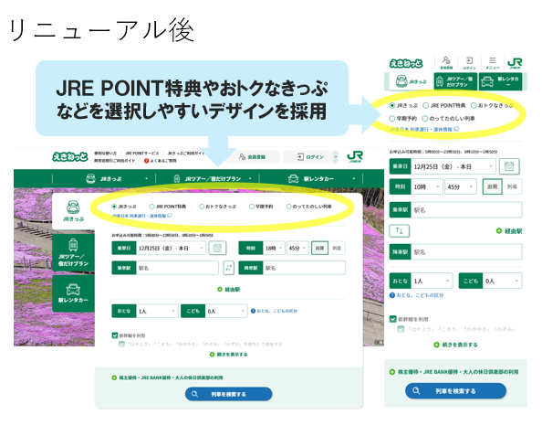 トップページ上部に、JRきっぷ・JRE POINT特典・おトクなきっぷ・早期予約・のってたのしい列車を選択するボタンを配置しました!