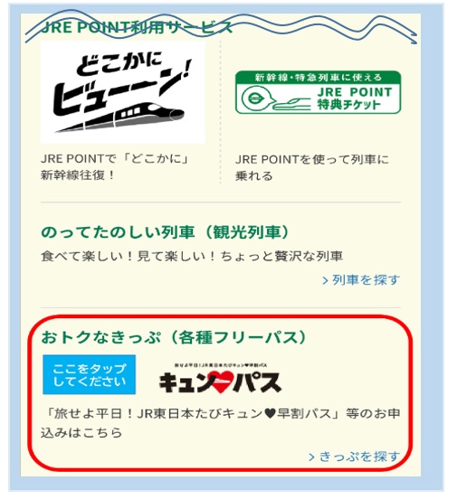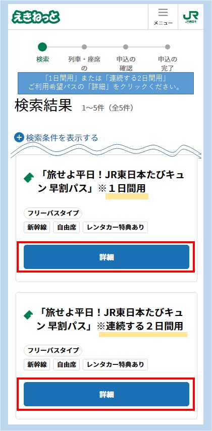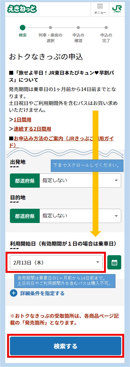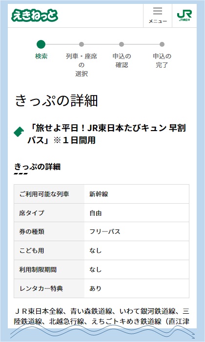 - 「旅せよ平日!JR東日本たびキュン♥早割パス」が表示されない場合は「土日祝日を選択している」「1ヶ月より先の日付を選択している」「13日以内の日付を選択している」等が考えられます。もう一度選択した日付をご確認ください。