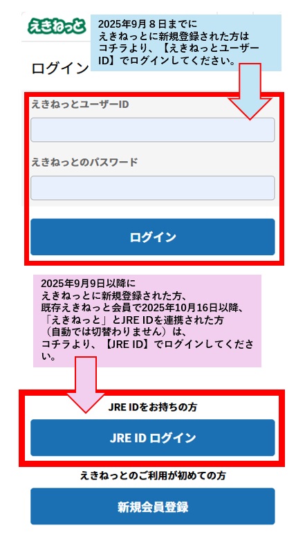 2025年9月9日以降に「えきねっと」新規登録されたお客さまは、【JRE ID】でのログインが必要です。「えきねっと」トップ ログインページ下部の【JRE IDログイン】ボタンをクリックしてください。