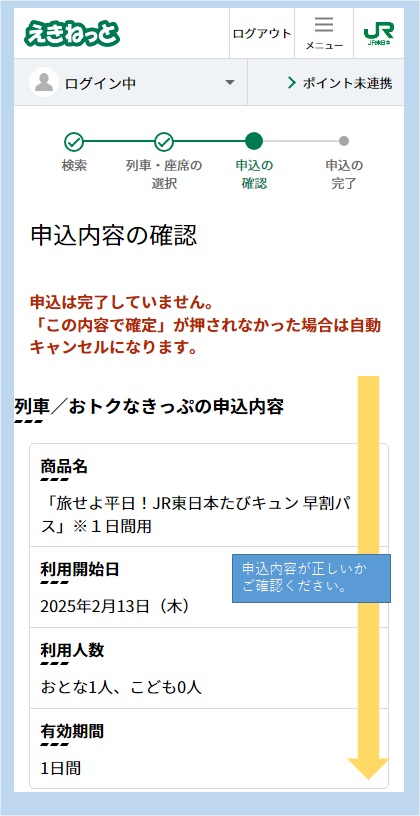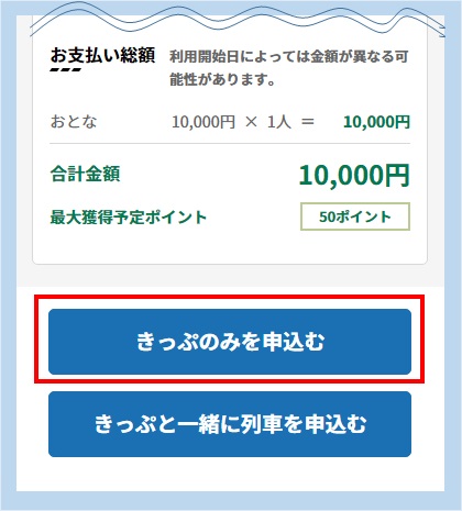 - 指定席を同時に申し込むこともできます。ここでは、パス本券のみを購入し、あとから指定席をお申込みする方法をご案内いたします。