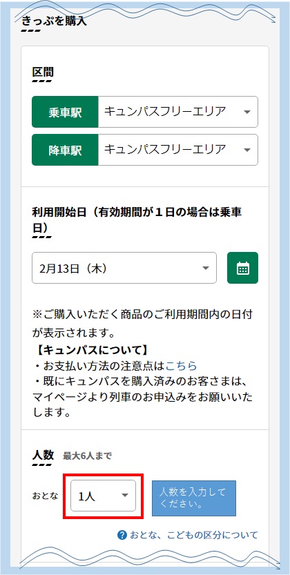 - 最大6名分までまとめて購入できますが、まとめて購入すると指定席申込時に同一区間しか予約できないという制限がうまれるため別行程を予定している場合は個別に1名分ずつ購入することをお勧めいたします。