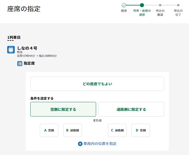 ①特急しなの号の座席は「シートマップ」から選ぶことはできません。「条件を設定する」から選択してください。