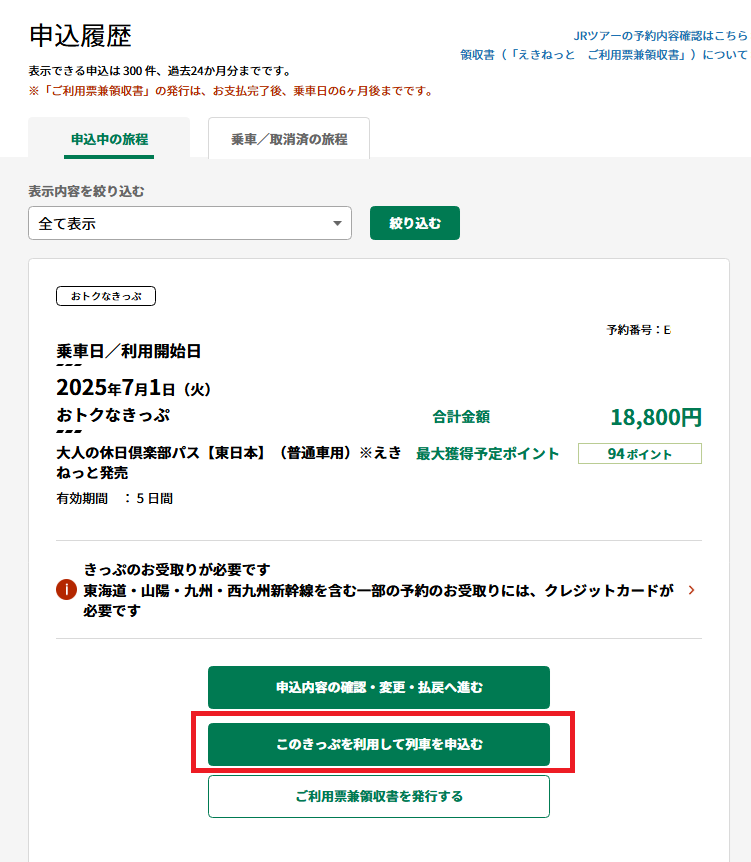 その枠内にある、「このきっぷを利用して列車を申込む」ボタンを選択します。