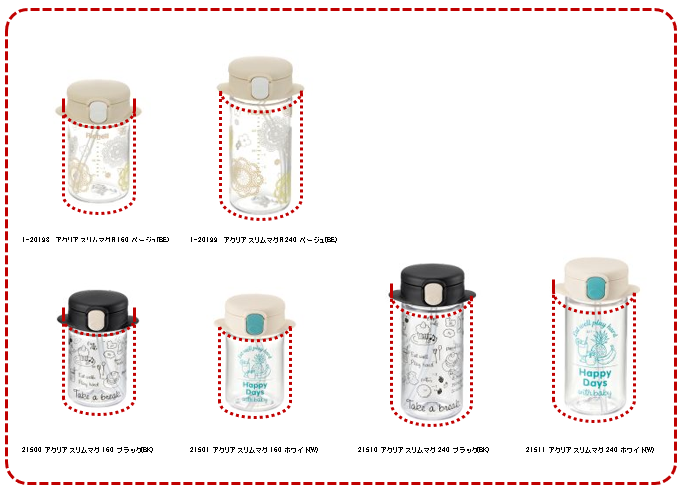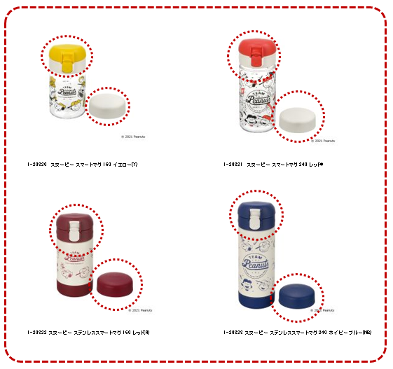 アクリア スリムマグ・アクリア スリムマグRのボトルに、スヌーピースマートマグ・スヌーピー ステンレススマートマグのダイレクトマグフタ、タンブラーフタはつけられます。(フタの別売りはありません)