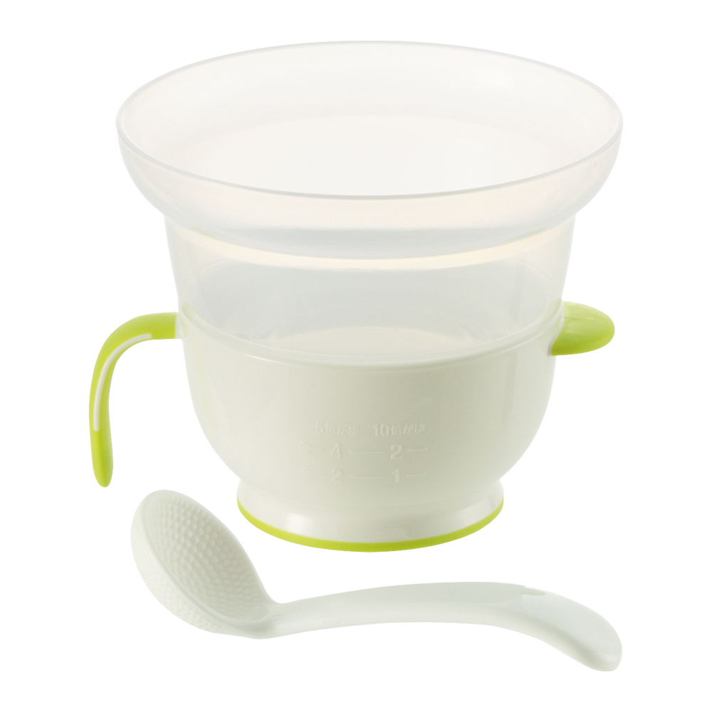 例…10倍がゆを100グラム作る場合のご飯の量は付属のスプーン山盛り2杯(約22グラム)です。