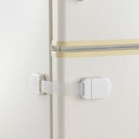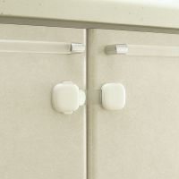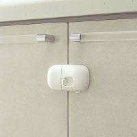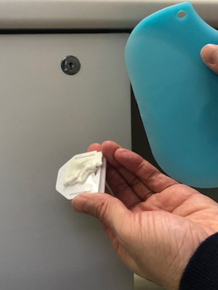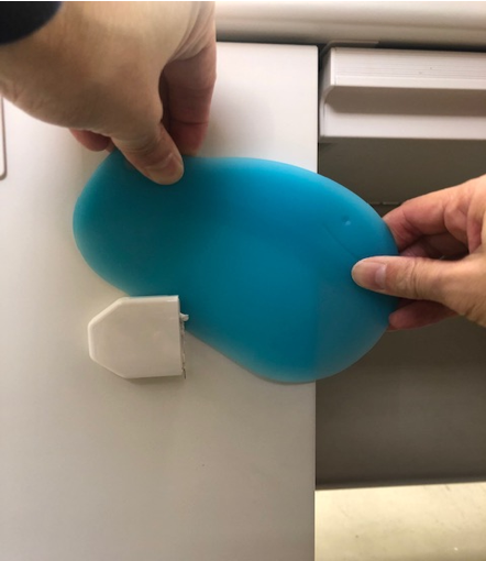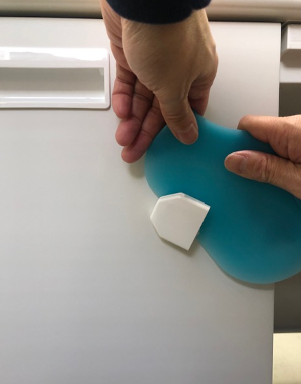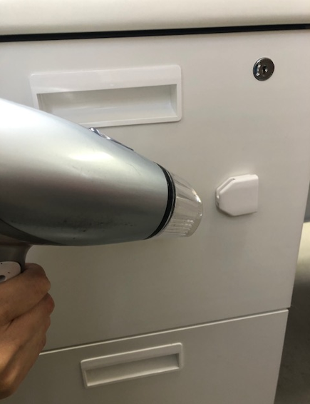 (3) ドライヤーで製品を3分間温めます。(画像ははがせる開き戸ロックです)
