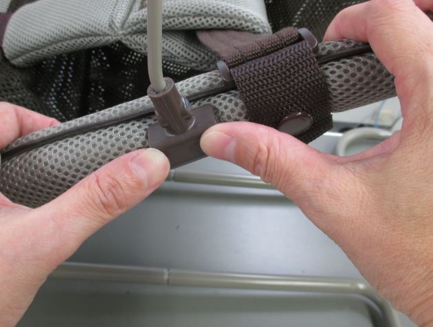 本体上部フレームのシートベルトとジョイントBの間に、両手の親指でおもちゃバー根元を押し付けるように取り付けてください。