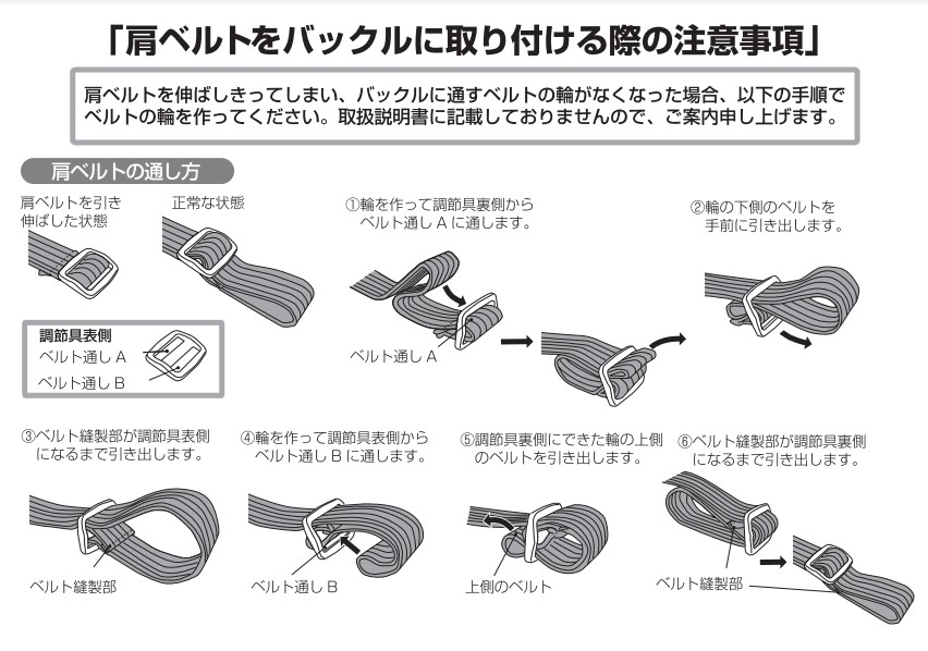 ベビーカーの肩ベルトを伸ばしきってしまい、バックルに通すベルトの輪がなくなってしまいました。どうしたら、輪ができますか(ファインアール カルネオ セキュア)