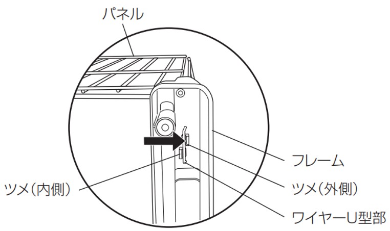 ワイヤーU型部に引っ掛かっているフレーム 裏のツメ(外側)をマイナスドライバーなど で広げるようにしながら、パネルをフレーム から引き抜きます。