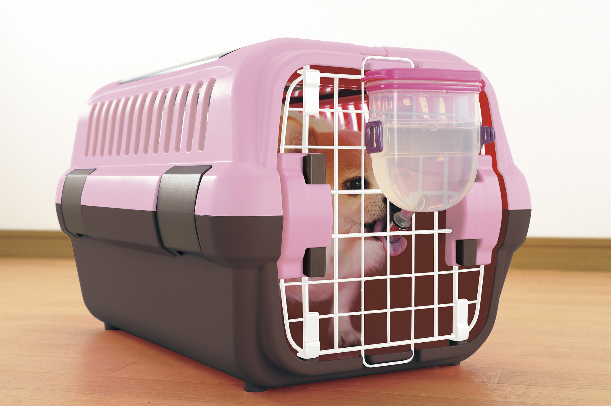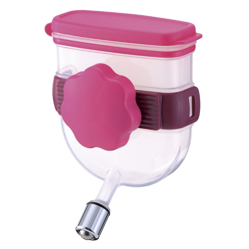 ※キャンピングキャリーダブルドアSライトピンク(販売終了品)にウォーターノズルキャリー用ピンクを取り付けた画像。