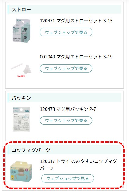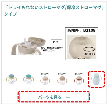 2-画面をスクロールし、トライ もれない保冷ストローマグ 300が載っている「トライもれないストローマグ/保冷ストローマグ」タイプの「パーツを見る」を開きます。