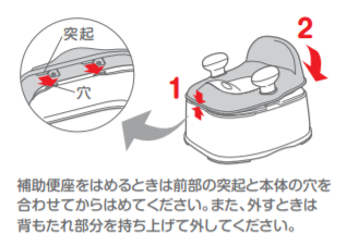 ポッティスおまる付属の補助便座裏面の突起は、おまる本体の穴に合わせてはめるためのものです。