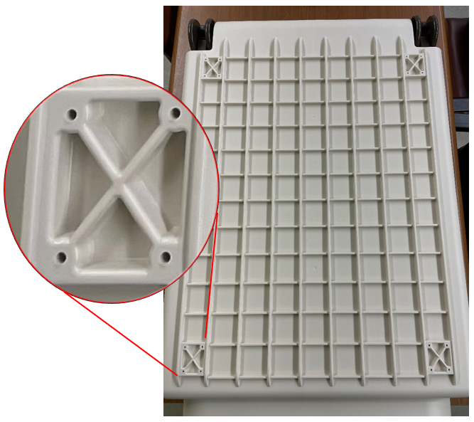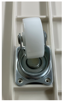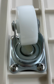 キャンピングキャリーXLアイボリー裏側。キャスター取付位置にはネジ位置にくぼみがあります。