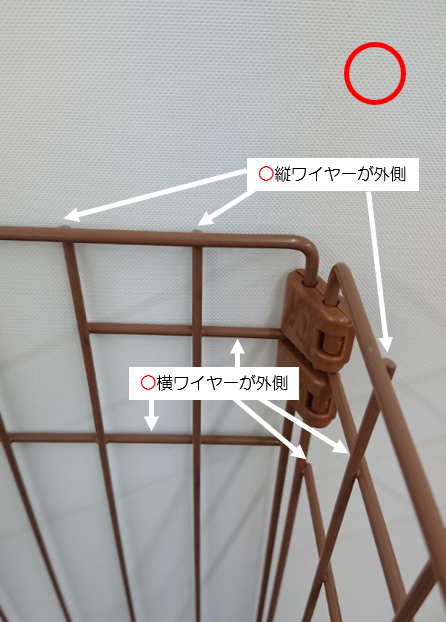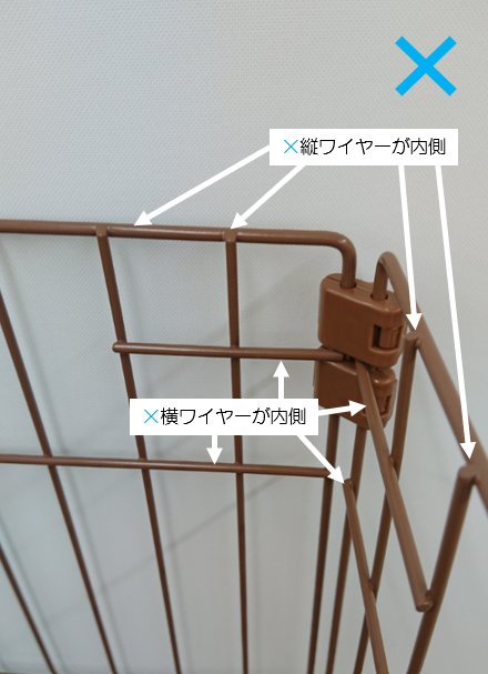 ジョイントNを取り付けるときに、パネルは下から2番目の横ワイヤーが外側になるように取り付けます。
