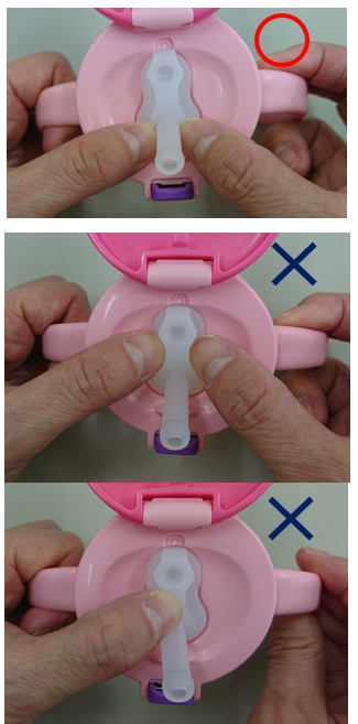 フタの表側から、飲み口の根元を両手親指で押し込んでください。