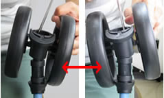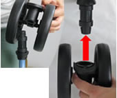 (4) 外れたら、製品をひっくり返した状態から元に戻し、正しい向きで前輪を取り付けます。
