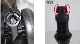 (2) 前輪がフレームにはまっている部分にドライバーなど細長い棒(太さ4㎜まで)を差し入れ、片方ずつ突起を押し、押した方から片方ずつ前輪を斜めにひねり上げます。