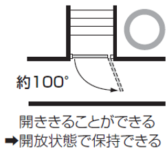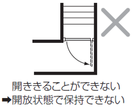 ただし、約100度に開ききることができない場合(×参照)や、約90度まで戻さずに手を離した場合は、開放状態で保持できません。
