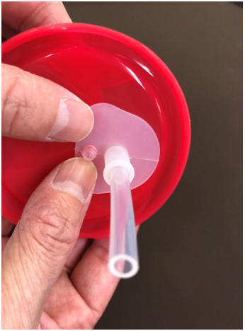 下記のようにお子様が口にする飲み口の先端をフタの裏側から差し込んでください。